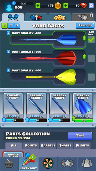 通过玩这款游戏并赢得比赛,您可解锁各种新的道具,并可将其用于定制您的飞镖。换上新的镖筒,重心更稳;换上新的镖杆,飞行更直;换上新的镖翼,轨迹更准。使用新的镖筒、镖杆和镖翼,您的飞镖将有独特的外观并获得性能提升。每一件道具,都是你赢回来的。