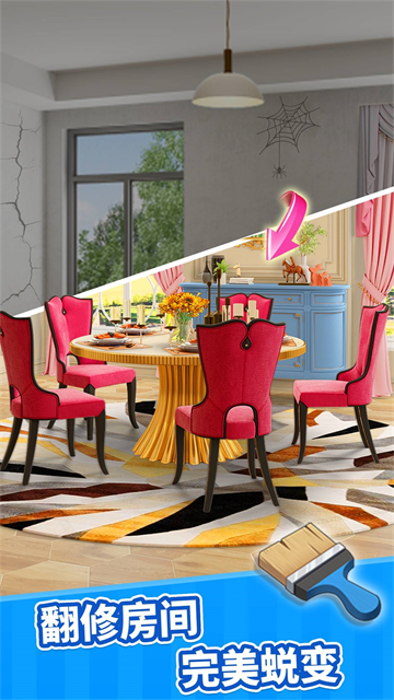游戏玩法简单易懂,没有复杂的内容。拖拽家具到房间里,合并相同的物品升级成更好的款式,收集散落的装饰品点缀角落。拖拽合并收集物件,进行家居设计,帮助你爱上家装。从空荡荡的房间到温馨的小窝,每一步都清晰明了。