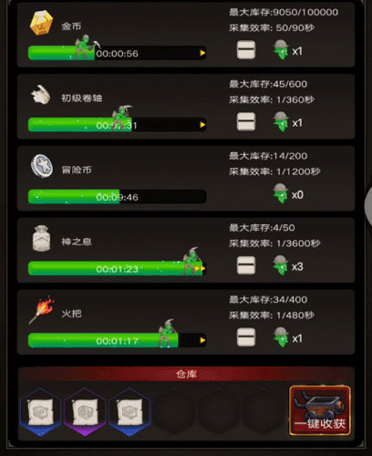 在矿洞里不仅可以获取金币,还能得到初级卷轴、冒险币、神之息、火把等资源。
