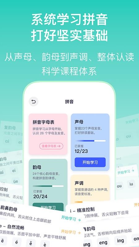 4. 渐进式学习路径设计:从拼音字母表到整体认读音节,再到简单汉字拼读,课程按“发音-词汇-句子”分级推进,每阶段设置明确目标,如完成声母学习后自动解锁“ba、ma”等双音节拼读练习。