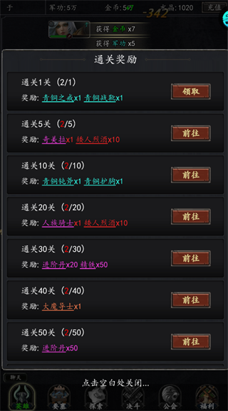 优先推进主线关卡,通过战斗获取金币、军功等基础资源,同时解锁后续养成系统与奖励。