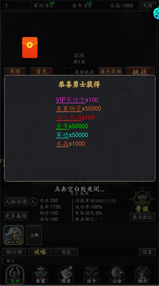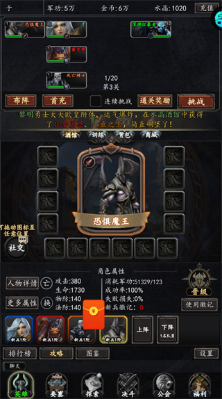 每通关指定关卡,及时领取装备、英雄、进阶丹等奖励,用装备快速提升角色基础属性。