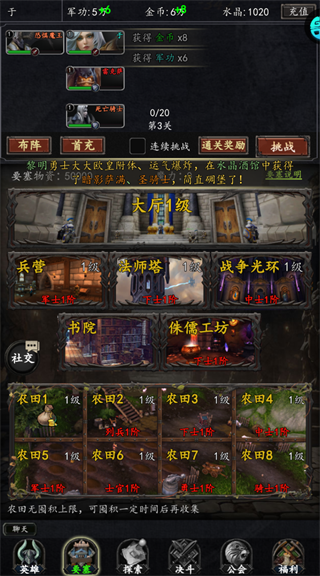 升级要塞内的兵营、法师塔、农田等建筑,获取属性加成与资源产出,实现战力稳步提升。