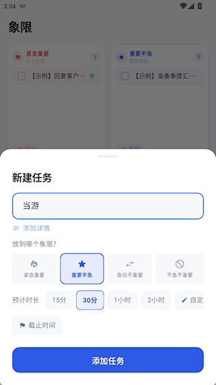 3、填写任务名称,设置所在象限和时间后保存