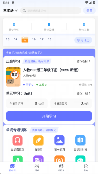 1、进入到背单词页面中可以看到许多的学习功能