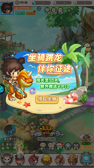 新手上线可领取初始坐骑「荒漠跳龙」,闯关至50关还能额外解锁VIP10,开局就能拿到核心代步与成长福利。