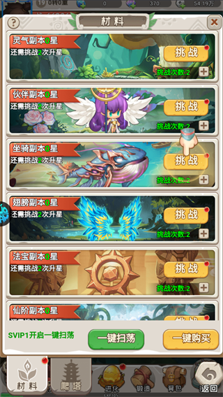 材料副本提供灵气、伙伴、坐骑、翅膀等全品类养成资源,每日挑战可稳定获取升星材料,SVIP还能解锁一键扫荡快速刷本。