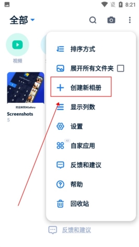2、接着会弹出很多的功能,点击【创建新相册】;