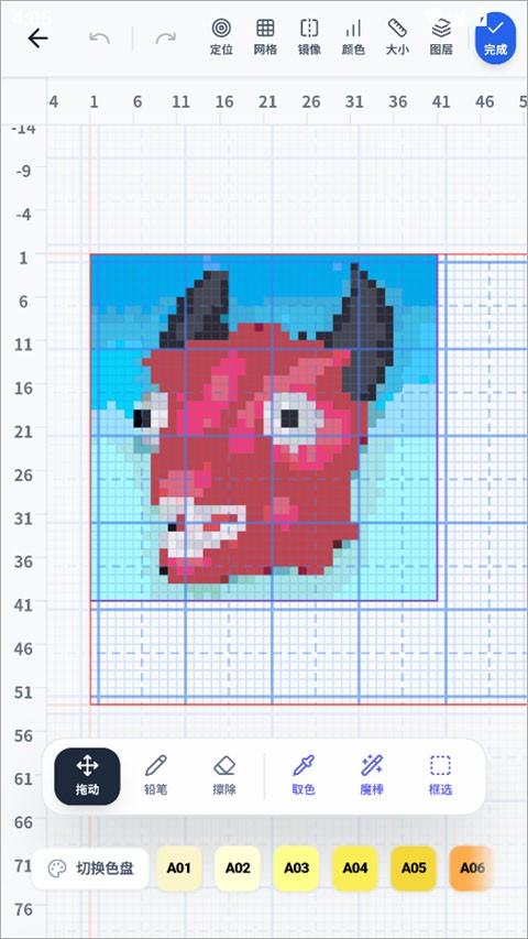 4、 手绘像素画:提供专业绘图工具,支持手动绘制像素图案,自由调整网格大小与颜色填充,激发无限创意。