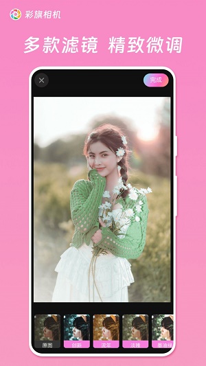 彩旗相机App,能够拍出你特别的美。这是一款超级好用的美颜拍照工具,App内里帮用户准备了海量的滤镜特色,还有超多的贴纸相框,可爱的、帅气的、ins风格、时尚大片,只要用户想的出来拍什么样的风格照片,在这里都能够一一实现。