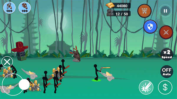 4、点击屏幕右侧的红色按键可以攻击,点击speedx2可以开启倍数,off auto开启自动让火柴人工作。