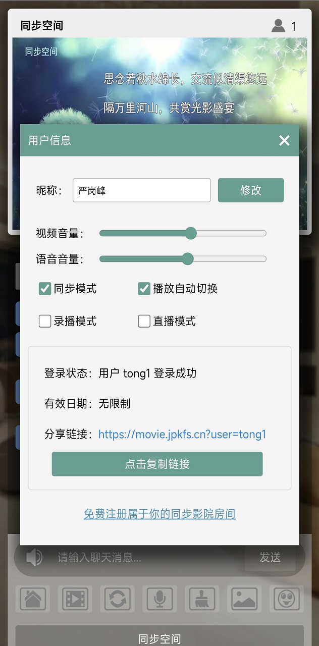同步空间一起追剧电影,这是一个同步观影的应用,身处异乡也可以和亲人共赴电影之约。软件简洁易用,无需激活,注册即可使用。