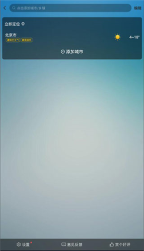 2、点击首页左上角的城市定位,可以来到城市标记页面,用户可以在这里对关注城市进行添加或者删除,左下角还有更多设置的按钮。