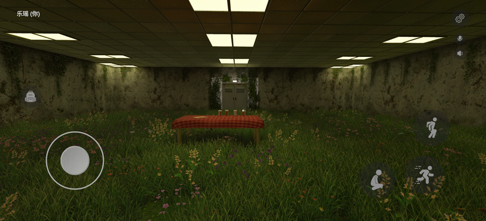 3、游戏采用第一人称视角,左侧轮盘控制移动,右边则为互动、跳跃、下蹲、奔跑等键位;