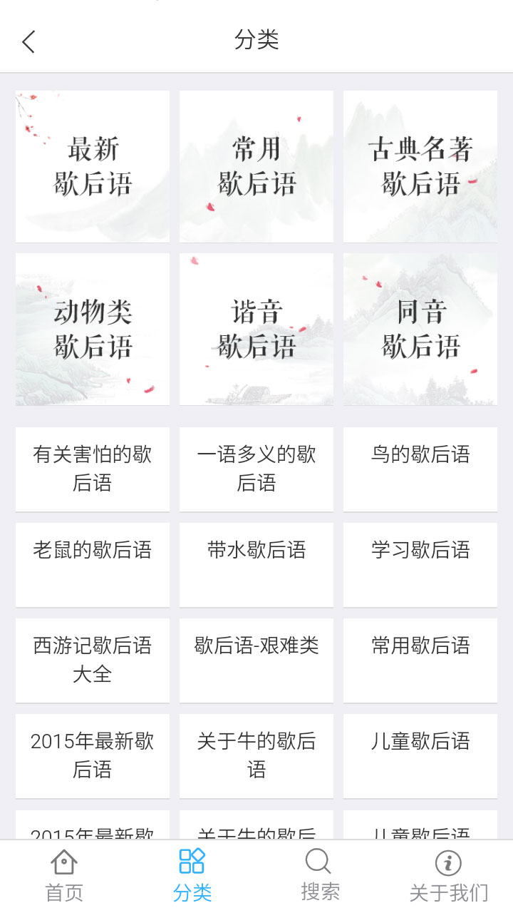 动物类歇后语、古典名著、谐音类、同音类、十二生肖类、常用歇后语等多体系歇后语