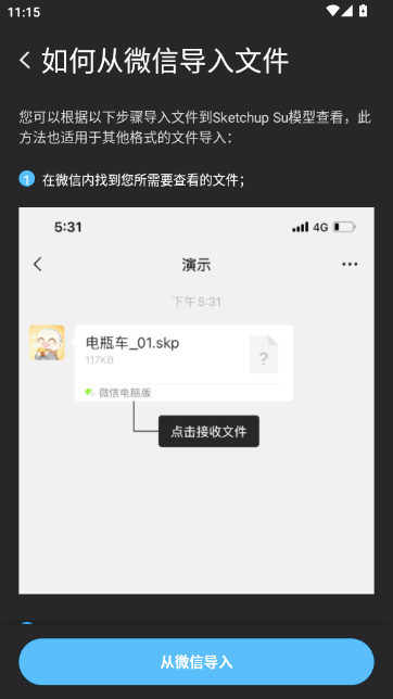7、查看微信导入教程,学习如何在微信中接收文件并导入App,实现无缝图纸查看。