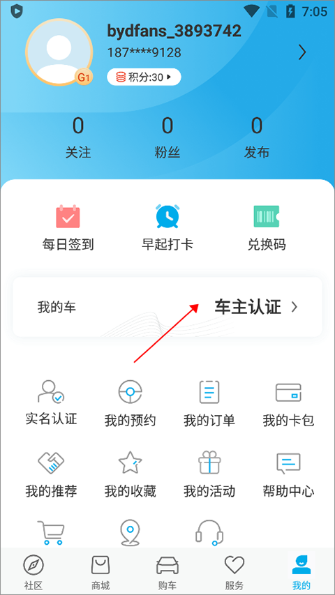 1、打开并登录软件后,进入“我的”页面,点击“车主认证”。