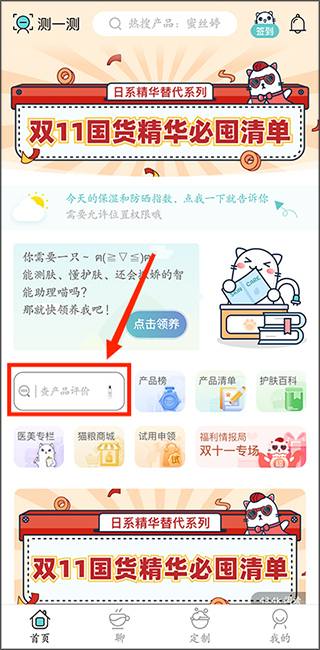 1、启动你今天真好看APP,在首页找到查看产品成分的搜索框并点击打开。