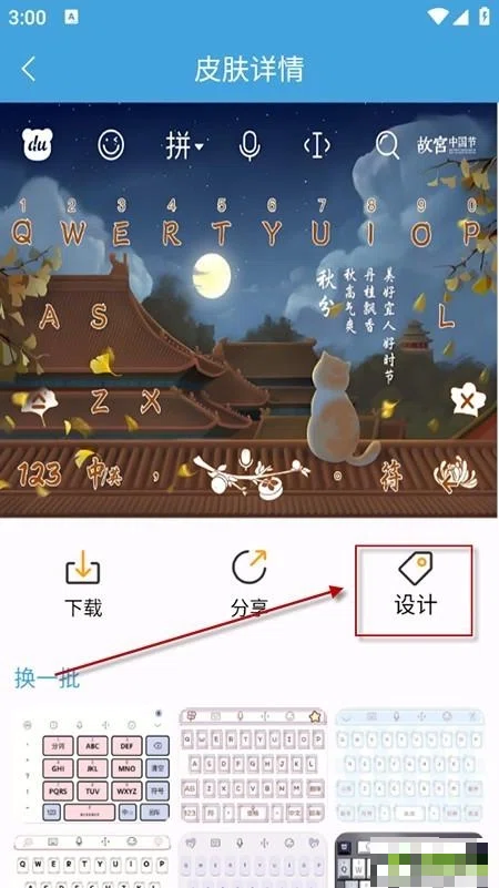 2、在首页找到“设计”或者“自定义皮肤”的选项,进入皮肤编辑器后完成自定义设置,接着点击“预览”查看效果,若觉得满意就点击“保存”,并将其应用到输入法上。