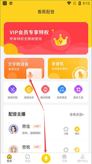 1、通过本站下载香蕉配音app并打开,在首页点击“文字转语音”,或点击下方“话筒”按钮,即可开启配音合成操作。