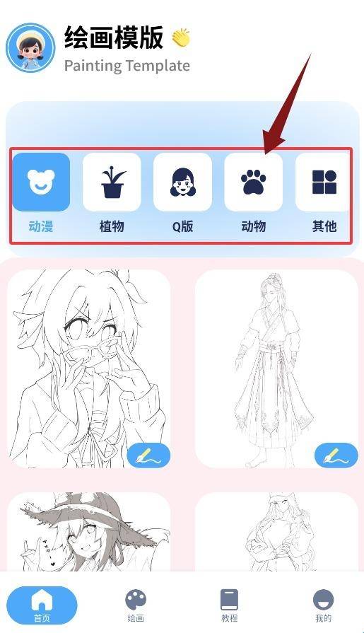 2、首页设置动漫、植物、Q版、动物等各类绘画模板,可供直接选用。