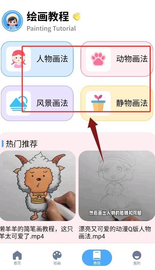4、教程界面涵盖人物、动物、风景及静物等绘画技法的教学内容。