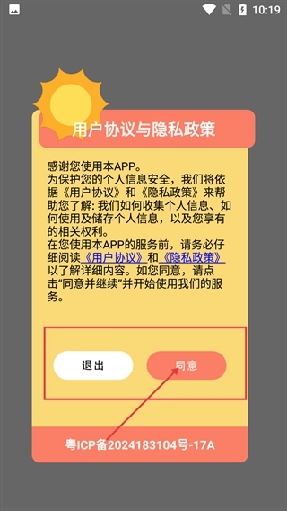 1、出现【用户协议与隐私政策】弹窗时,仔细阅读其中的【《用户协议》】和【《隐私政策》】,阅读完毕点击【同意】即可继续使用服务。