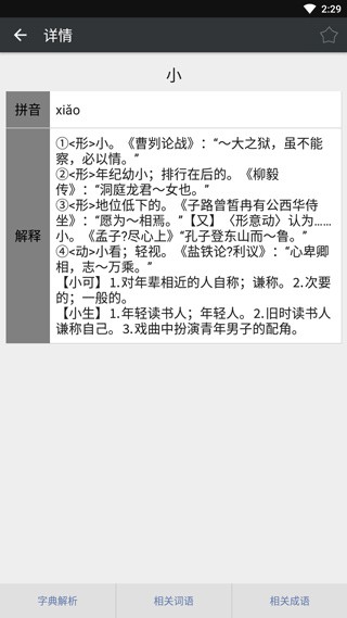 3、支持文字字典解析,同步呈现相关词语及成语内容,丰富知识储备。