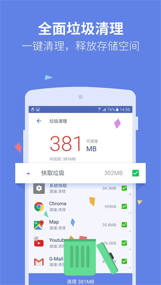 3、【空间清理】扫描并清理应用缓存、无用文件及广告缓存,释放更多手机空间,缓解内存压力。