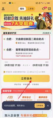 1、打开神州租车app,先选择合适的取车点与还车点,选定后点击【立即选车】。