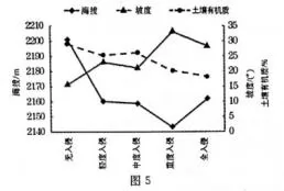 长白山高山苔原位于长白山火山锥体上部(海拔约为2000-2500m),主要以灌木苔原为主,很少有草本植物。在全球气候变化背景下,原先位于长白山苔原带西坡较低海拔的草本植物不断上侵,原有的灌木开始萎缩退化。下图为草本入侵程度与环境因子变化关系示意图。