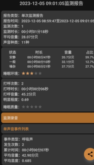 3. 监测结束后,别呼呼会生成包含打呼噜次数、时长、声音大小等指标的睡眠质量报告。