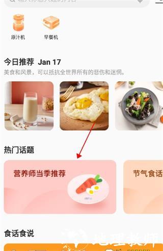 1、在手机上打开九阳爱下厨软件,进入首页后点击 “发现” 板块,向下滑动屏幕,找到 “营养师当季推荐” 栏目。