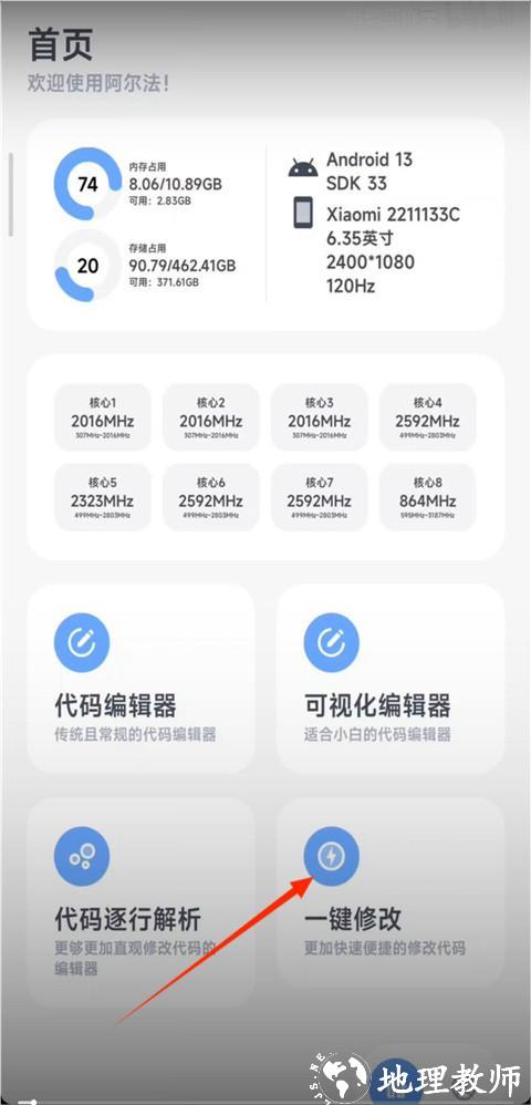 1、首先需在手机中安装目标游戏,若无游戏则无法进入软件;可先安装和平精英、香肠派对等支持的游戏,随后点击软件内 “一键修改” 功能。