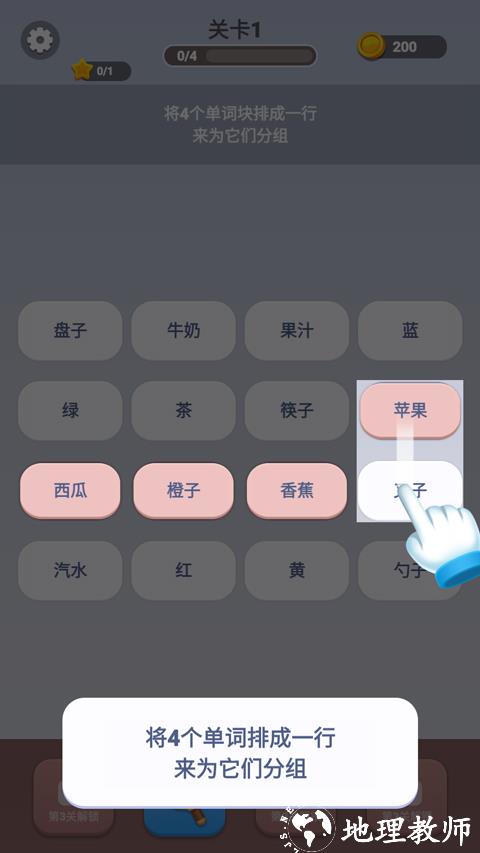 2、拖拽分组验答案:将词汇拖拽到相应分组区域完成分类,若正确,词汇会自动归组并点亮。