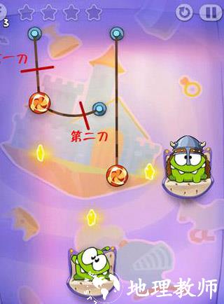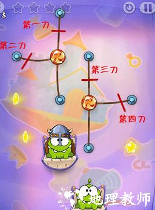 第四关:左边的糖果先切竖直的线,吃到星星后就切断最左边的线。右边的绳子同理。