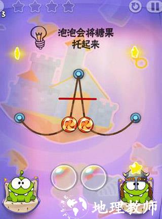 第五关:先同时切断中间的两条线,让糖果吃到泡泡飞起,然后到了顶点后切断绳子同时把泡泡点破即可。