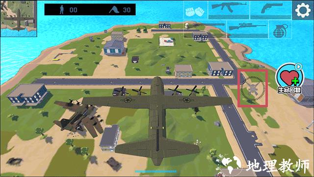3、现在就跟随飞机来到战场吧,点击右边的红色方框内的功能选项进行跳伞;