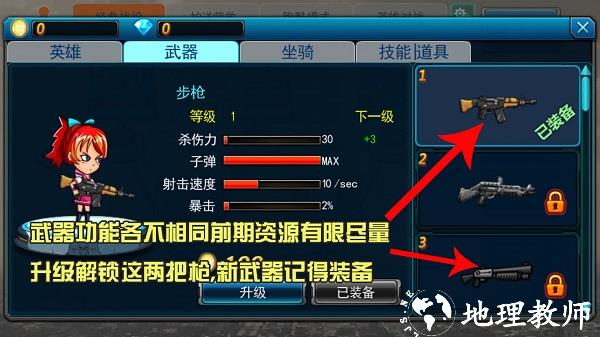 武器功能各不相同,由于前期资源有限,尽量升级解锁这两把枪,新武器记得装备。