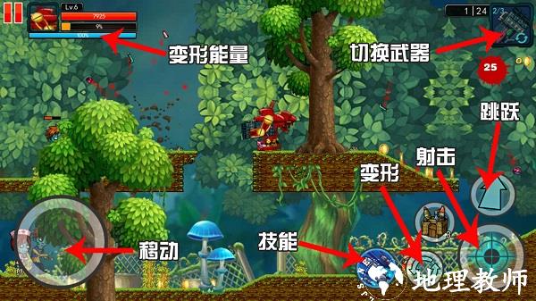 如图所示,战斗界面的左上方是玩家的生命值和变形能量,往下是移动摇杆的虚拟按钮。