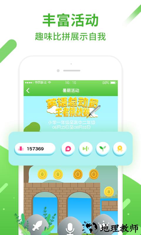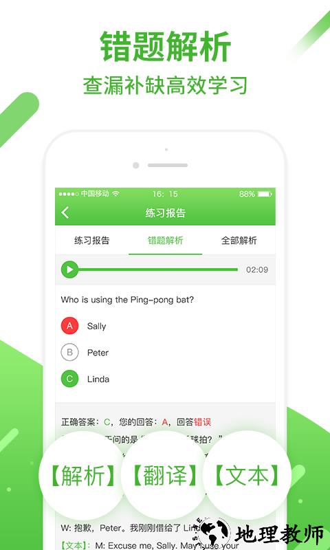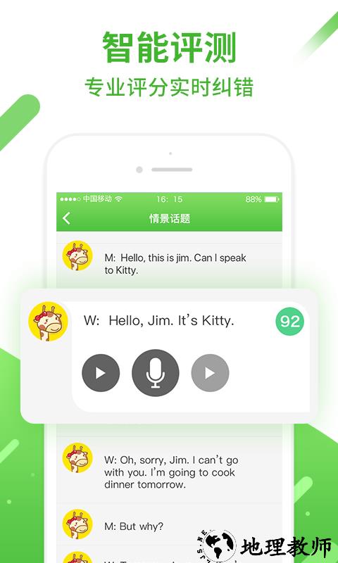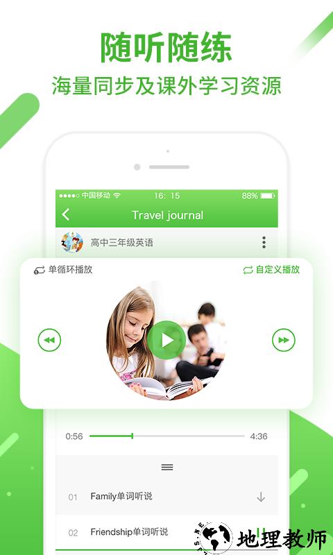 与课堂同步,标准音示范、纠错,单元配套听力、笔试习题、听说模拟真题训练,智能评测打分