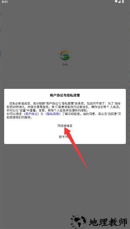 1、初次使用需阅读用户协议与隐私政策,确认无误后点击同意并接受按钮进入。