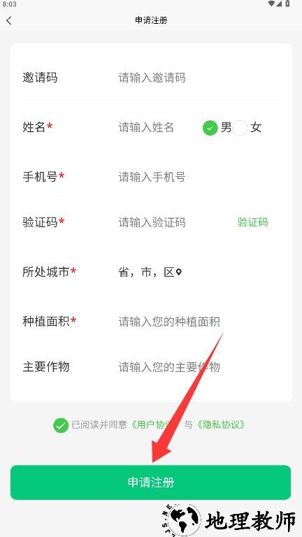 4、填写完整邀请码信息、个人详细资料及农业相关数据,确认无误后提交注册申请操作。