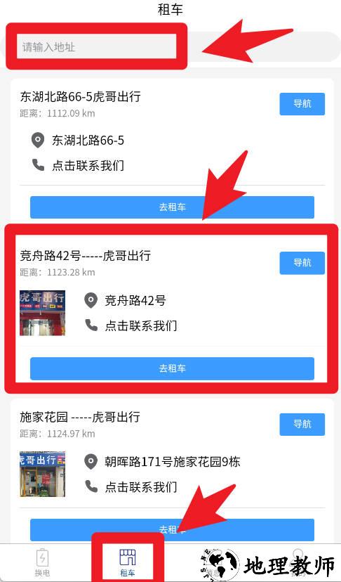 3、在租车界面,用户可以输入地址搜索附近门店,系统会显示门店信息、联系方式以及租车入口,方便就近选择。