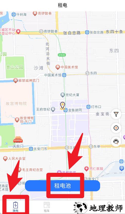 2、在租电界面,用户可以通过地图查看附近站点并点击租电池按钮,方便快速找到并租赁所需电池。
