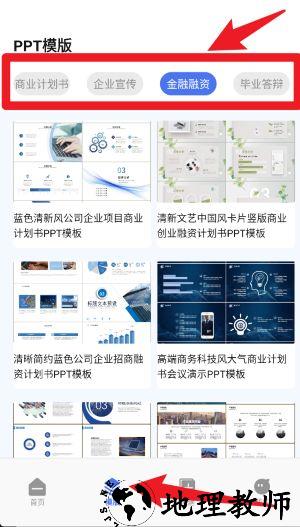 3、在模板页面中可根据商业计划书、企业宣传、金融融资等标签快速浏览对应模板资源。