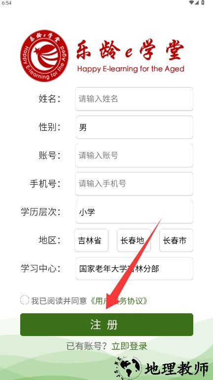 3、按要求填写姓名、性别、账号等个人信息,选择学历地区后完成注册流程。