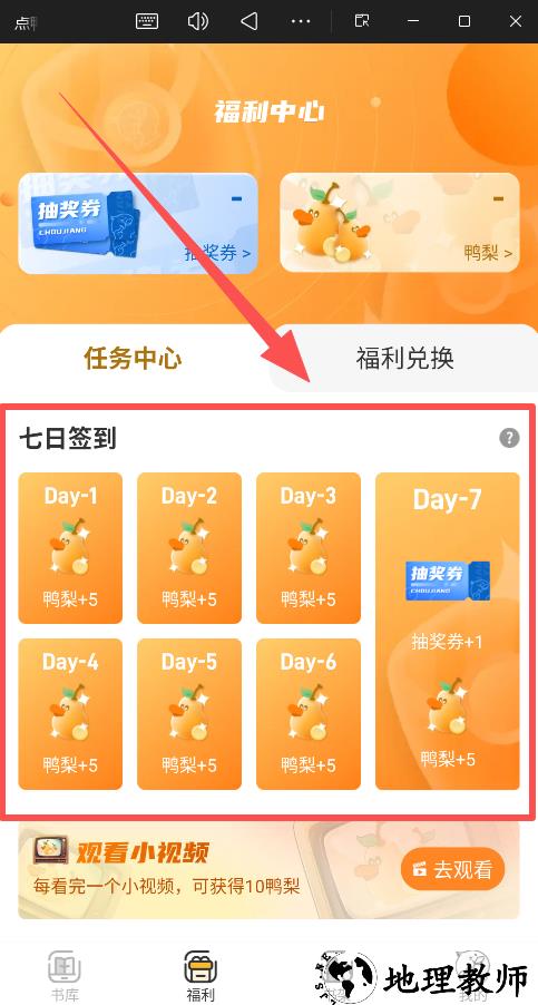 进入 “福利” 中心,通过每日签到和观看小视频来积累“鸭梨”,为后续阅读储备“弹药”。