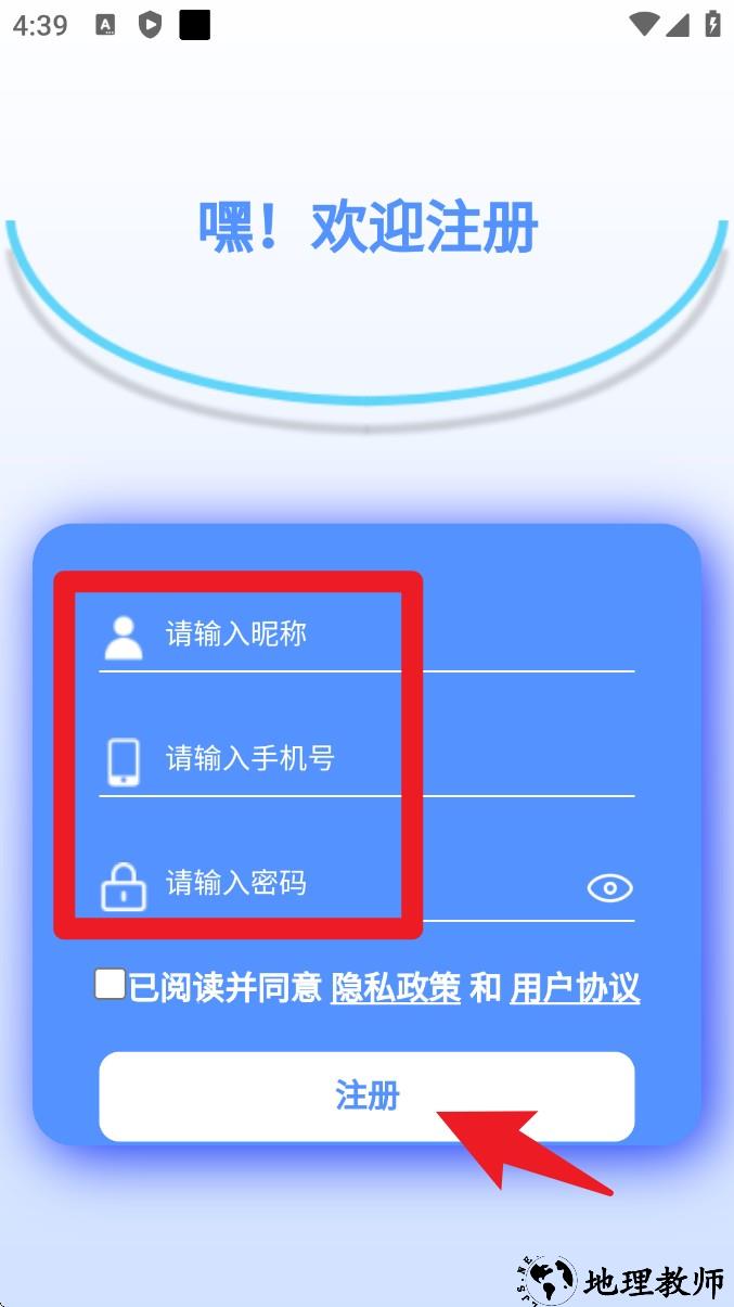 1.打开App进入注册页面,依次填写昵称、手机号与密码,勾选同意协议后点击下方注册按钮完成账户创建。