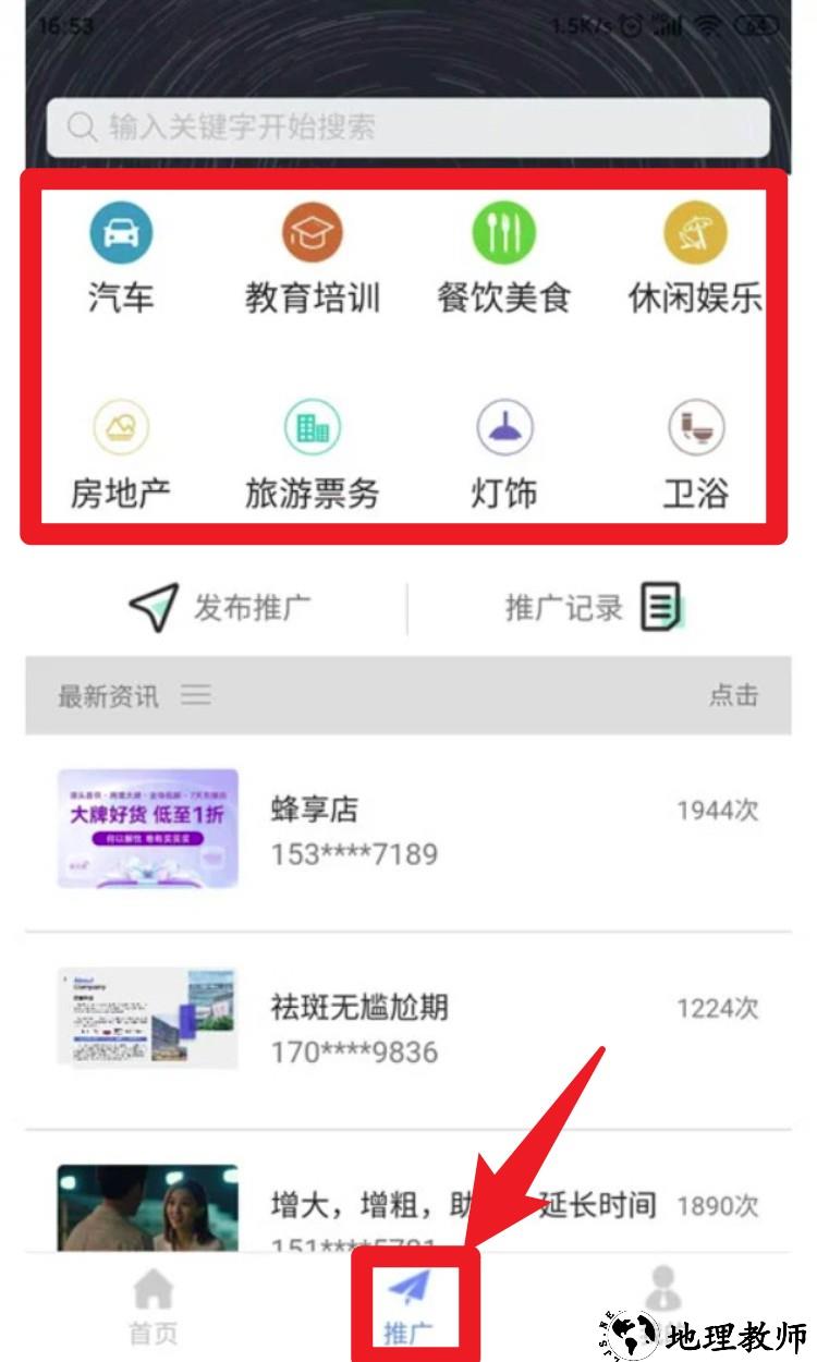 4.点击底部导航栏中的推广,可进入行业分类页面,根据不同业务如教育、美食、旅游等浏览推广内容。